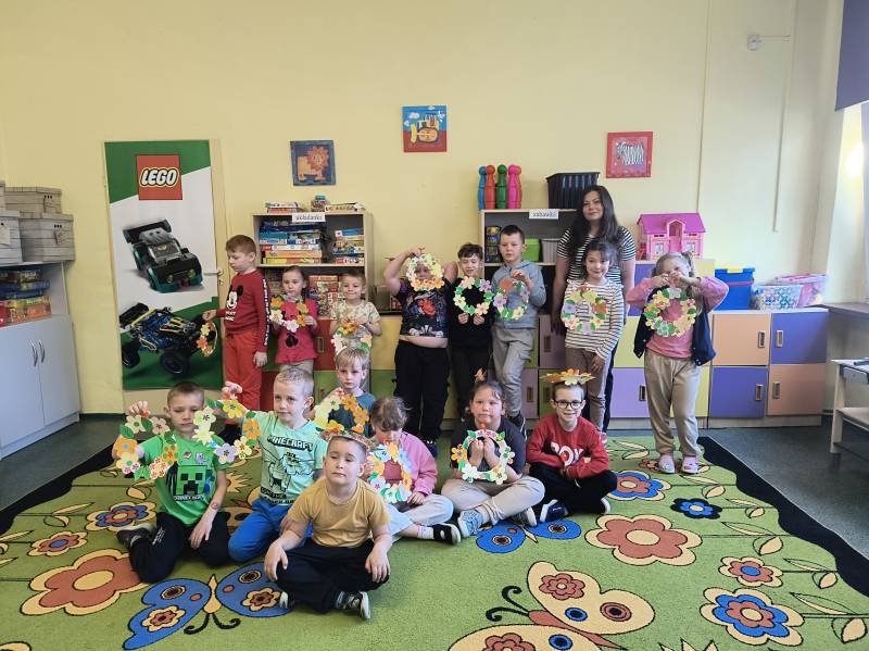 Wychowawczynie z Ośrodka Wsparcia Dziennego poprowadziły warsztaty plastyczne, podczas których dzieci tworzyły wianki wiosenne z papieru. Bo kto powiedział, że wianki muszą być z żywych kwiatów? Przedszkolaki z pomocą Pani Ali udowodniły, że papier, klej i odrobina fantazji wystarczą, by stworzyć coś magicznego!