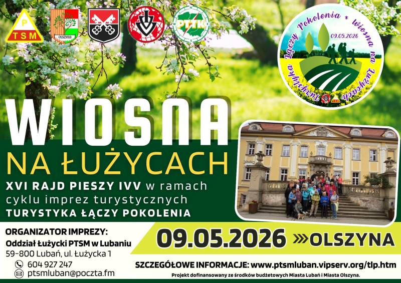 Oddział Łużycki Polskiego Towarzystwa Schronisk Młodzieżowych w Lubaniu, Międzyszkolne Koło PTSM „Piast” w Lubaniu, Osiedlowe Koło PTTK nr 35 w Lubaniu, Urząd Miasta Lubań, Urząd Miasta i Gminy Olszyna, Polska Federacja Popularyzacji Turystyki w Szczecinie organizują w dniu 09 maja 2026 r. (sobota) XVII Rajd Pieszy na trasie o długości 11 km według zasad IVV pod nazwą „WIOSNA NA ŁUŻYCACH” z cyklu imprez „Turystyka Łączy Pokolenia".